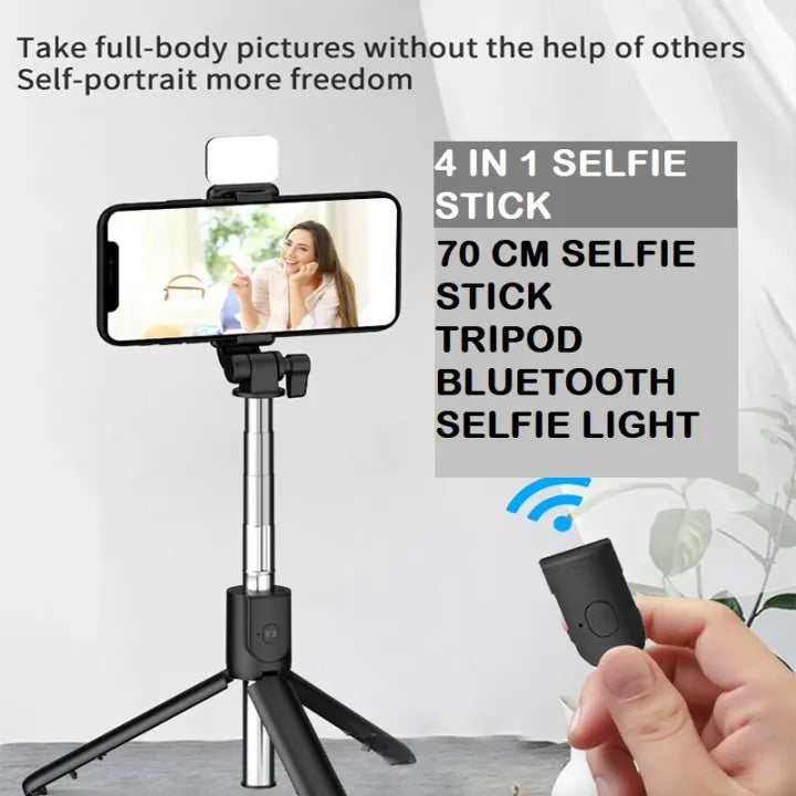 The R1S Selfie Stick is a versatile 4-in-1 tool combining a selfie stick, tripod, selfie light, and Bluetooth remote. It offers stability, lighting, and convenience for perfect photos and videos every time.